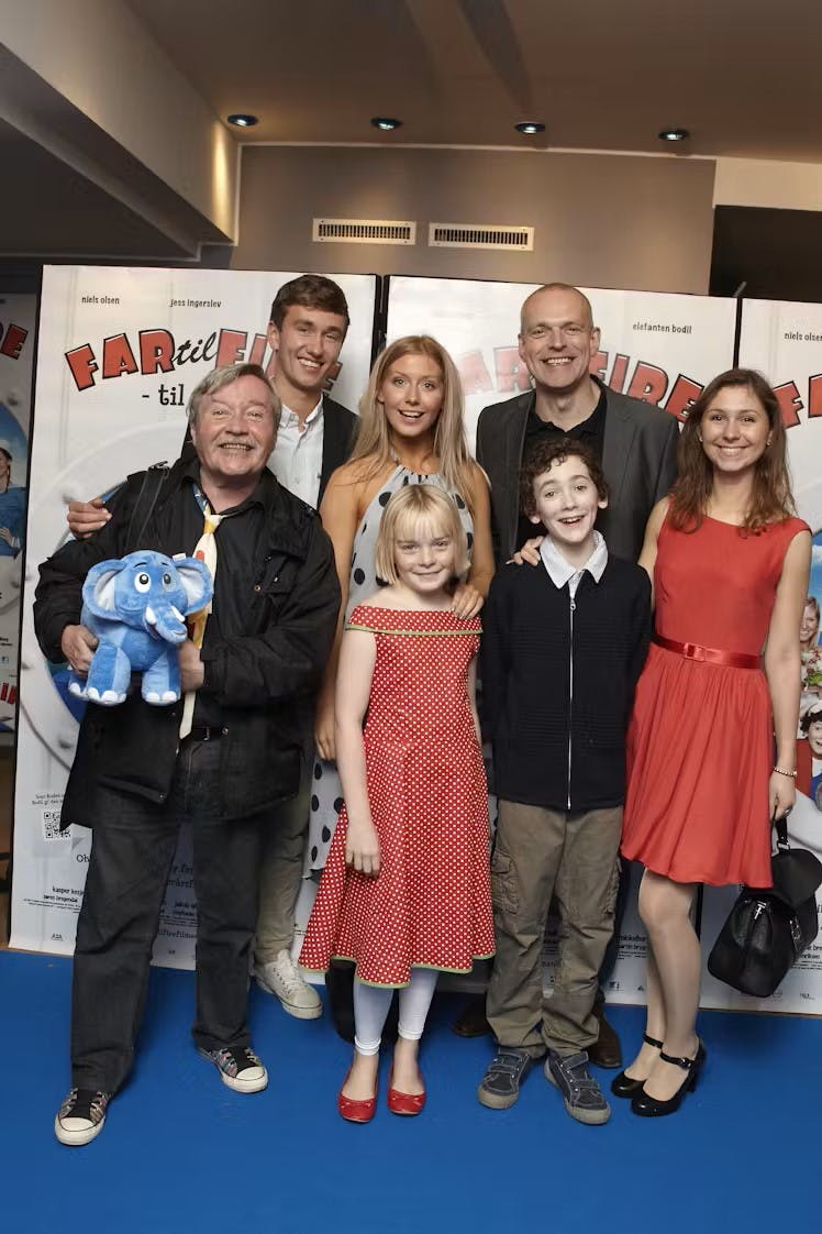 Carla Mickelborg sammen med flere af skuespillere fra castet af "Far til fire"-filmene.