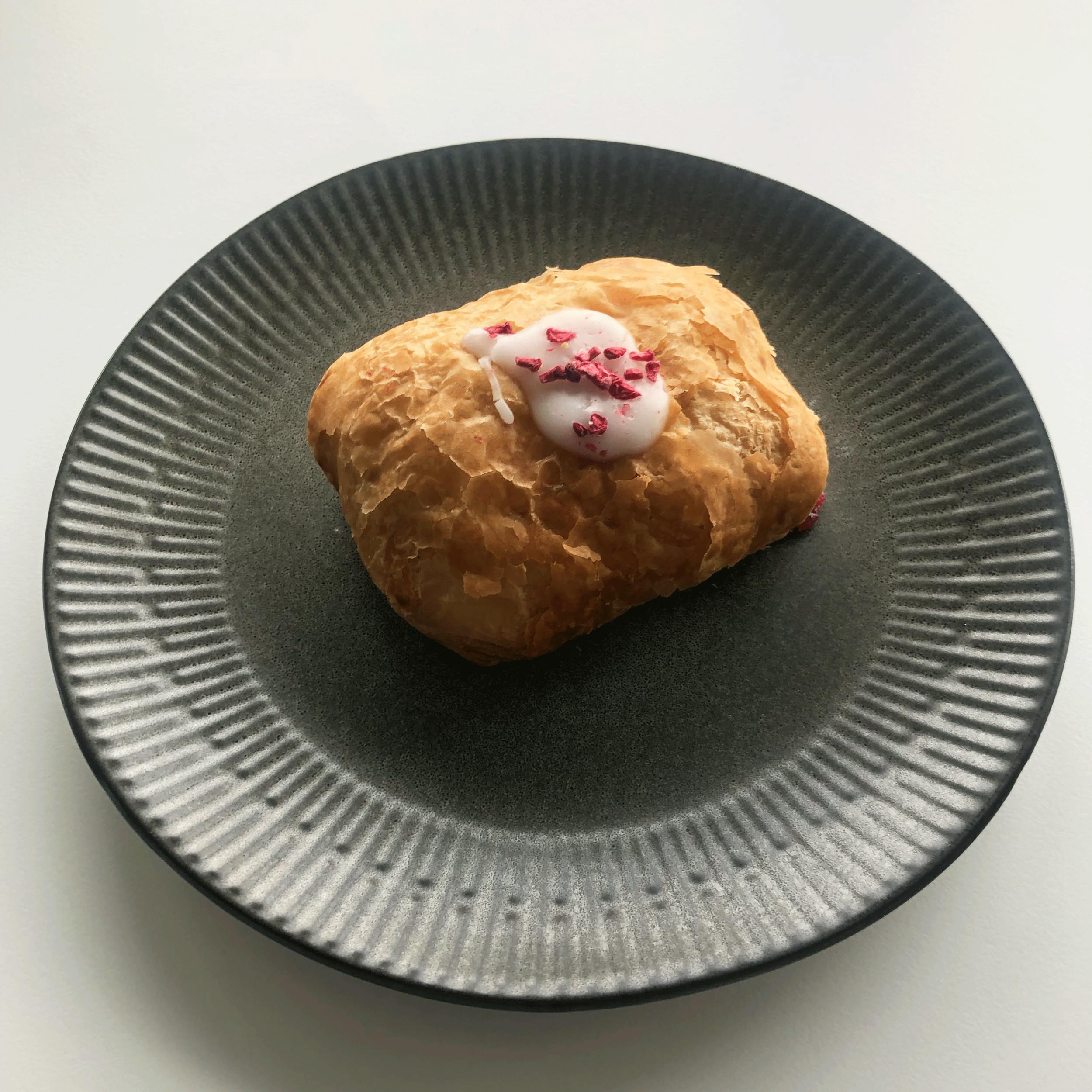 Creme og creme. Det er rent faktisk en form for hindbærcoulis/syltetøj inde i bollen. Det smager som helt almindelig hindbærsyltetøj – hverken dårligt eller helt fantastisk.