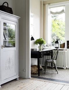 Laila og hendes mand har engelsk blod i årerne, hvilket indretningen af villalejligheden tydeligt bærer præg af. Gamle engelske arvemøbler står side om side med nyere, moderne møbler. Men det har også været vigtigt for familien at bevare husets oprindelige charme og skandinaviske udtryk med de lyse og lette toner.