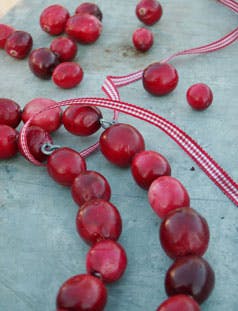 Tranebær er super dekorative til bl.a. små kranse som her trukket på elefant-tråd. Oplagte til ophæng de fleste steder i hjemmet, eller blot placeret på et fad med f.eks. lidt blød enebær og et par julekugler omkring.