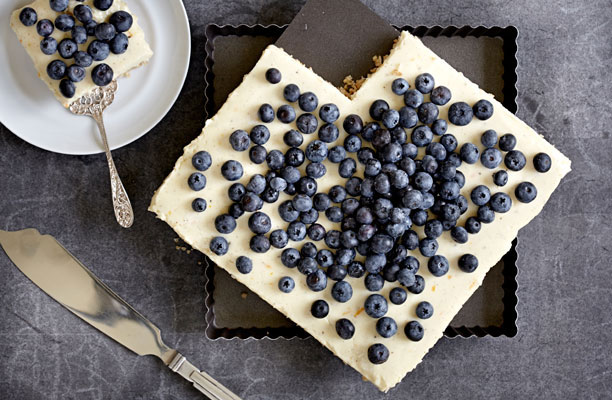 Sæt kagen på køl, skær den i små firkanter og anret på et fad.