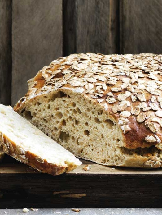 Tid: 30 minutter. Hævetid: Mindst 12 timer. Bagetid: 30 minutterMængde: 2 store brød DET SKAL DU BRUGE125 g hele speltkerner10 g gær8 dl koldt vand 1 dl yoghurt naturel1 kg fint speltmel2 tsk. salt2 dl speltflager