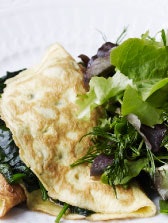 Steg 4 små omeletter på én eller flere små pander; fyld dem med spinat. Servér straks omeletter med røget makrel, salat med krydderurter, rugbrød og smør.