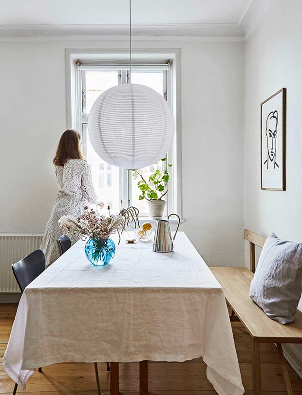 HVOR Aarhus Anna Cecilie Philipp deler sin 82 kvadratmeter store lejlighed med kæresten Jacob Bergholdt Nygaard, og ved et kig rundt i hjemmet i Aarhus ses det tydeligt, at parret har en forkærlighed for naturlige materialer. Anna Cecilie fortæller, at træ, flet, hør og papir skaber en rolig og harmonisk base for parret, især lyse træsorter som eg og fyr. – Egentlig begyndte det med, at vi købte en Poul Volther-stol i eg, og så kørte det derfra. Vi kan godt lide at holde os til få træsorter, da det skaber sammenhæng i vores hjem, siger Anna Cecilie, som også har indrettet med andre danske designklassikere. – Ordet skandinavisk beskriver vores stil rigtig fint. Jeg er opvokset med dansk design, som har en renhed og enkelhed, som jeg finder æstetisk lækkert. De karakteristika gør, at dansk design spiller sammen, hvad enten det er en Poul Volther-stol eller en lampe fra Le Klint, fortæller Anna Cecilie.