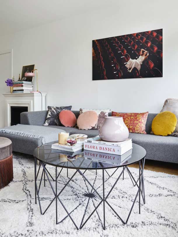 3 tip til den feminine stil Brug grå og hvid som baggrund for feminine farver. Det giver dem lidt kant – og du kan nemt skifte dem ud med en helt anden farveskala, hvis du bliver træt af dem. Kig efter hverdagsting i smukke emballager, f.eks. skønhedsprodukter og te – og stil tingene frem som pynt. Detaljer i guldfarvet og messing giver din indretning lidt luksusfølelse – og der skal ikke så meget til. KOM MED INDENFOR I DEN FEMININE LEJLIGHED I GALLERIET HERUNDER