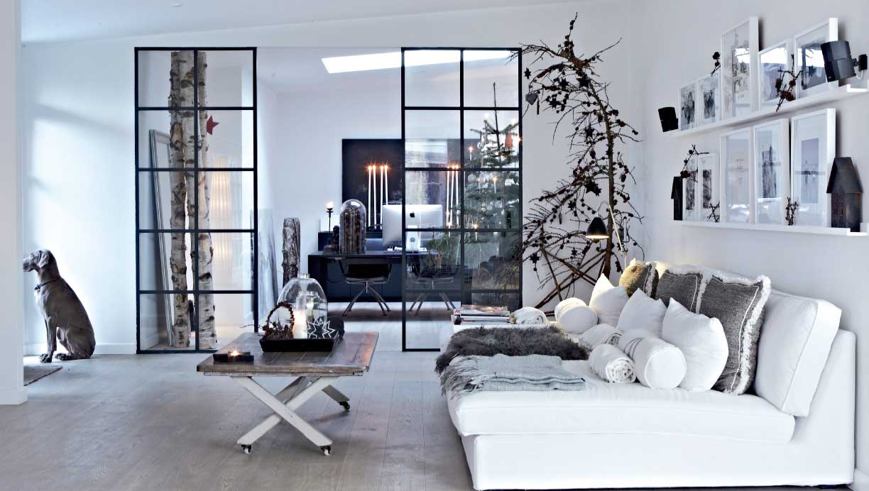 Kæmpestore vinduespartier udvisker grænsen mellem inde og ude i Vibeke og Mortens multirum med højt til loftet. Til jul bliver naturen inviteret helt indenfor, når familien pynter op med grantræer, lærkegrene og kogler ad libitum.
