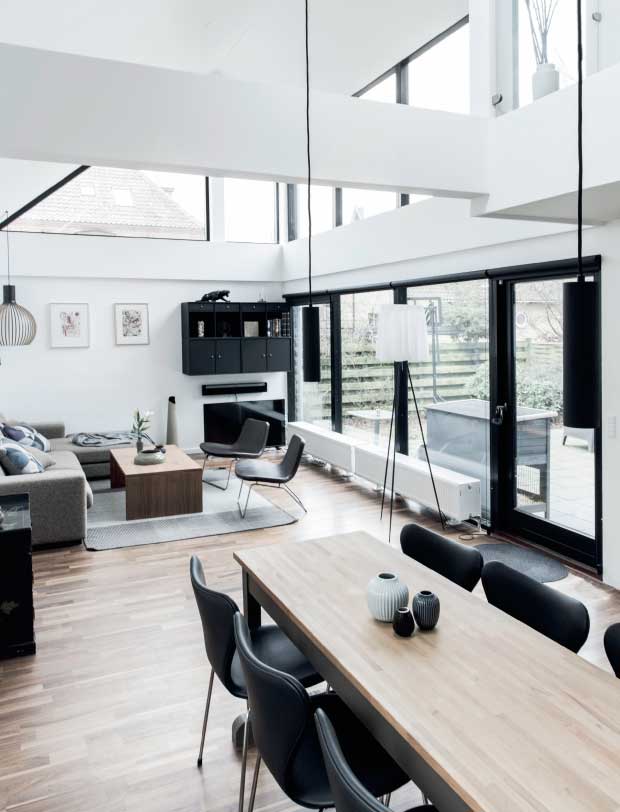 Hvem? Amanda, 42 år, og Henrik, 45 år, sammen med deres to børn, Alberte på 14 år og Cornelia på ni – og kaninen Laban. Hvad? Moderniseret 70’er-villa på 215 m². Hvor? Gentofte. Sådan får du den stramme stil INDRET I SORT OG HVID med masser af træ. VÆLG HELT ENKLE moderne møbler med rene linjer. NIPS ER TILLADT, hvis det er glas eller keramik i jordfarver.