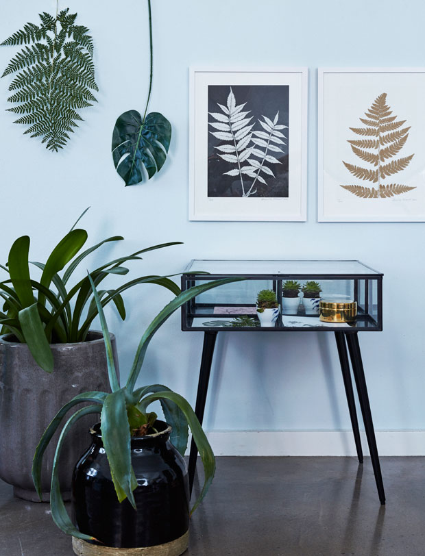 Botanik og grønne blade giver stue, køkken og soveværelse et levende, frodigt udtryk. Vi har sat store planter i krukker og hængt pressede og kunstige blade på væggen. Indrettet med botaniske print – og redt op til en lur med sengetøj med smukke slyngende ærteblomster.