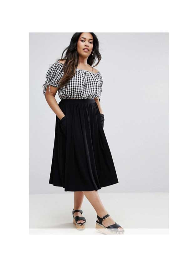 Som æbleformet kan du stolt vise dine lækre ben frem. Vælg derfor en nederdel, der eksempelvis med syninger eller andre detaljer trækker opmærksomheden ned mod benene. En nederdel med flæser eller læg, som skaber kurver ved hofterne og samtidig viser dine stænger frem, er også rigtig god til dig.
