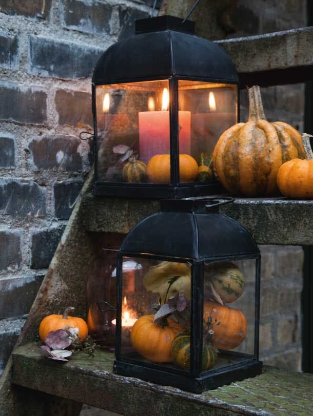 Sæt lys i dine lanterner, og læg små græskar i bunden – det er en nem og fin måde at byde gæsterne velkommen på ved trappen eller hoveddøren. Fyld evt. også en enkelt lanterne med lutter forskellige små græskar, og udelad lyset. Det vil se sødt ud sammen med et par større græskar. Lanternerne er fra Notre Dame, vasen i rosa glas er fra Lyngby Porcelæn, og det farvede bloklys er fra Cozy Living (link fjernet).
