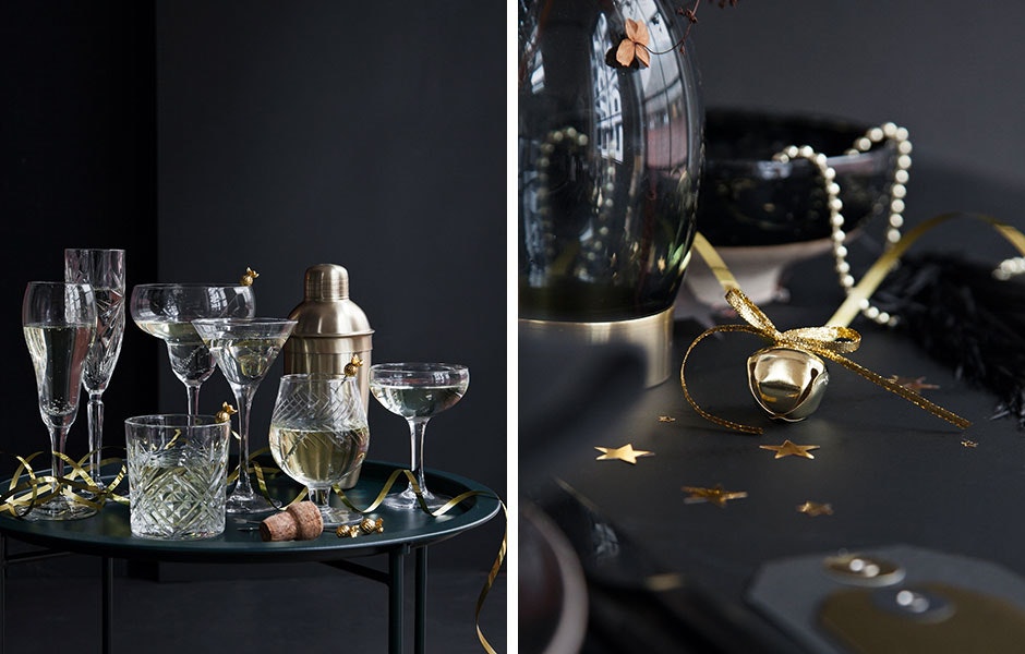 Billede tv.: Put guldglimmer og små guldstjerner på glas og brug dem som alternativ til bordbomberne. Læg et rør på hver tallerken, så gæsterne hver især selv kan pynte omkring sig.