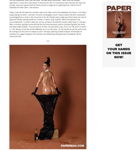Realitystjernen Kim Kardashian vakte tidligere på måneden opsigt, da billederne af hendes afklædte bagdel blev offentliggjort i Paper. Screendump fra Papermag.com
